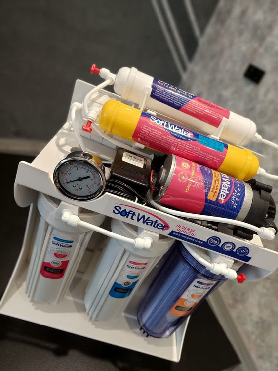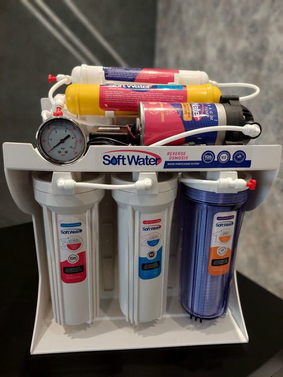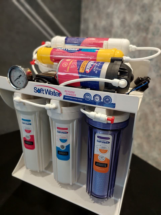 دستگاه تصفیه کننده آب سافت واتر 6 مرحله ای هوزینگ مرحله اول شفاف و فیلتر یک میکرون برای مرحله ی اول و فیلتر مرحله دوم 100 % گیاهی، فیلتر مرحله سوم 5 میکرون الیافی